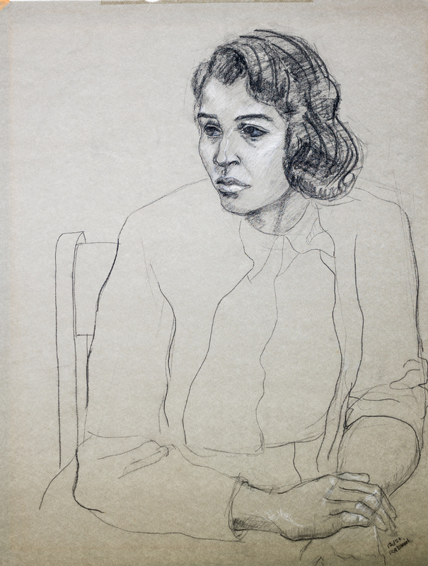 Robert A. Daniel was an artist from Tallahassee, FL. Seated Figure is a portrait of a Black woman sitting in a green chair in front of an ironing board. She seems to be resting from doing domestic labor.