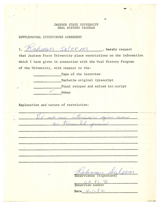 Rahman Saleem was a student at Smith Robertson School starting in 1956 when he was 5 years old. He talks about his experience at the school and tells other stories of his childhood in Jackson. The transcript is heavily edited with handwritten notes.