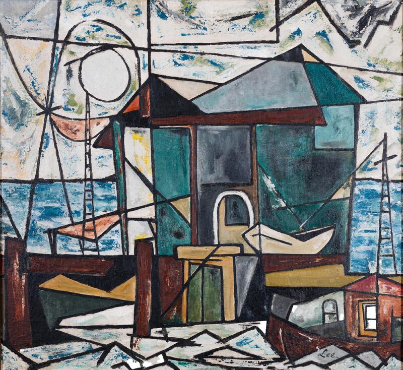 Harvey W. Lee Jr. was born in St. Louis, MO, and he moved to Daytona Beach, FL. to teach art history professor at Bethune-Cookman College in 1952. Seascape depicts a house by the sea. The cubist painting uses intersecting stark black lines with shades of brown, green, blue, and red to create a full composition.
