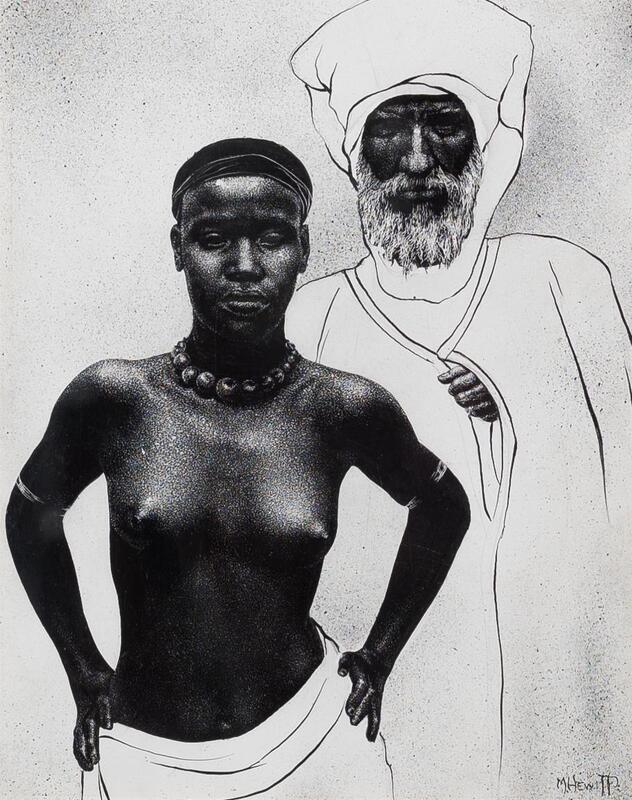 Mark Hewitt was an artist from Boston, MA. Slave Girl is a black and white print of a young African woman standing before a bearded man wearing all white. The man’s hand rests on his chest, and the shirtless woman wears a solemn expression and looks towards the viewer.