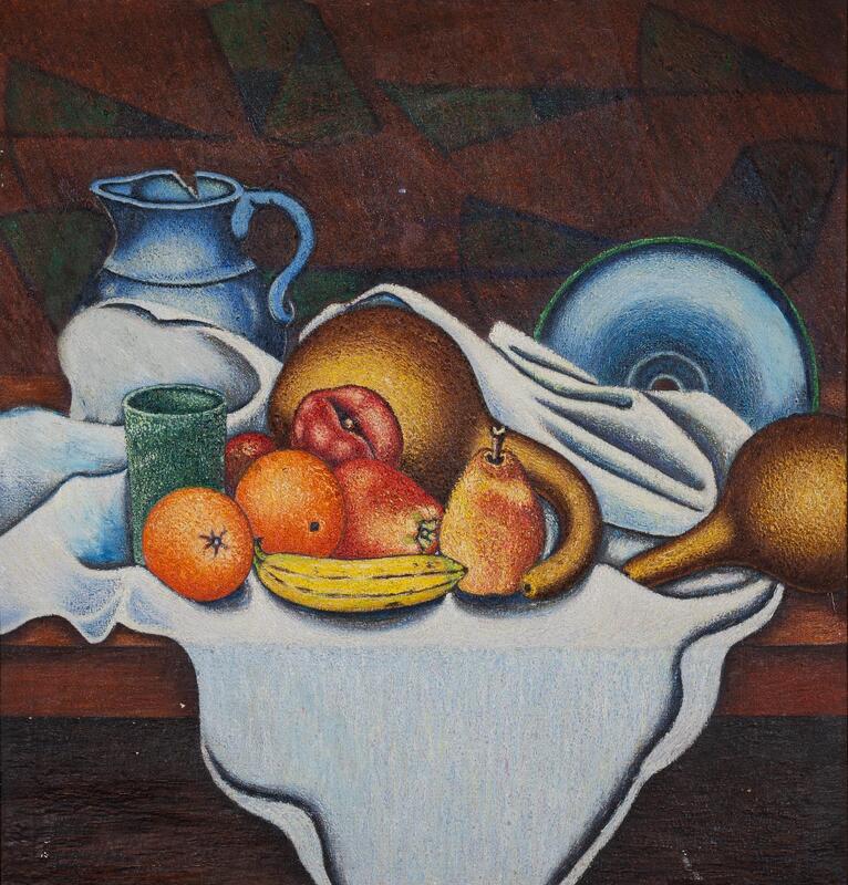 Alfa Bell was an artist from Montgomery, AL. Still Life with Fruit is an abstracted print of inanimate kitchen objects with an abstracted background. The piece features a cup, pieces of fruit, and gourds on top of a white sheet in front of a water pitcher and a plate.
