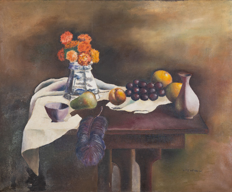 William S. Carter was an abstract, landscape, still-life, and figurative painter from St. Louis, Missouri. Still Life embodies its namesake by depicting a table of commonplace objects with a muted background. Carter's subjects include a teacup, a vase with flowers, fruit, a feather, and an empty vase on top of a haphazard cloth.