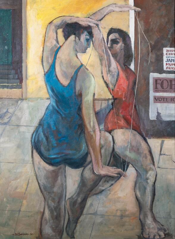 Walter Augustus Simon was an art historian, professor, and artist best known for his abstract oil paintings from Petersburg, VA. String Dance shows two women dancing with a thin white string. Their arms are stretched above their heads to pull the string as they dance together barefooted.