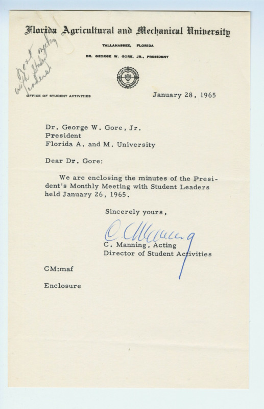 On January 26, 1965, the president’s monthly meeting with student leaders brought together representatives from campus organizations. The president invited all organization presidents to a dinner to discuss initiatives and improvements students wished to see at Florida A&M University, fostering collaboration and shared goals for the campus.