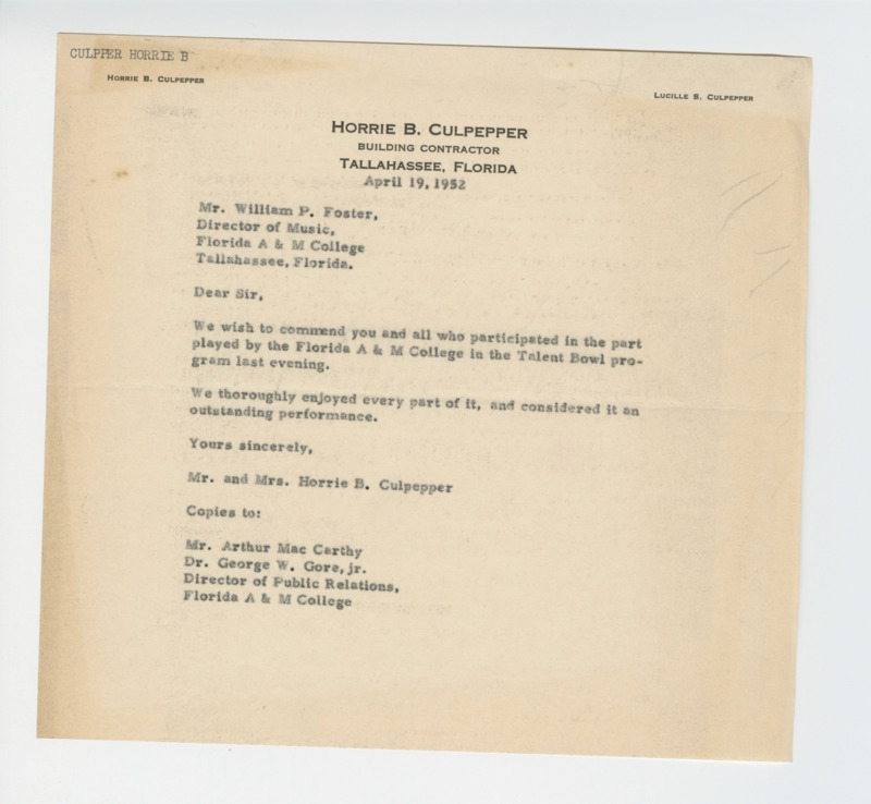A collection of letters, invitations, and documents related to Dr. William P. Foster and the Florida A&M University Marching Band, Foster's Symphonic Band program, travel plans to Atlanta, and a letter outlining the band’s performance at Tennessee A&T. This collection showcases Foster's efforts to expand the band's reach and reputation.