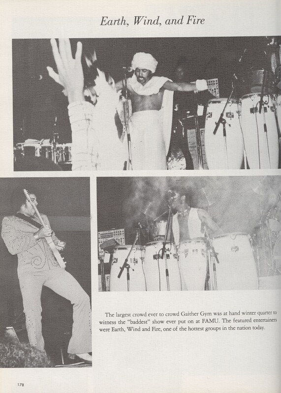 In 1975, Earth, Wind, and Fire, a funk and soul band headed by lead singer Maurice White and best known for their hit song “September,” visited Florida A&M University. According to the caption in the yearbook in which these images were featured, the group drew “the largest crowd to ever crowd Gaither Gym.”