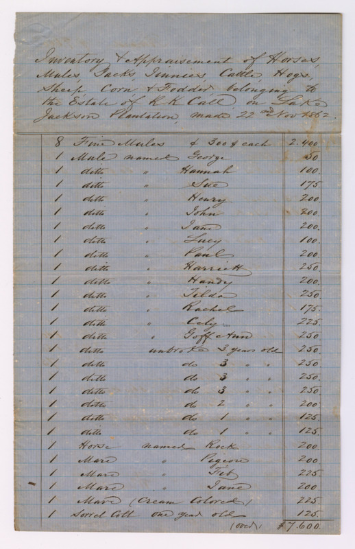 These rare 1862 slave documents from the Richard Call estate provide a detailed account of enslaved individuals at the Lake Jackson Plantation in Florida. These records include names, ages, and roles of enslaved people, offering critical insight into the operations of the estate and the broader system of slavery during the Civil War era.