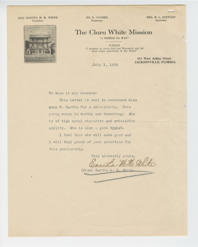 Eartha M. M. White’s letters to President W. H. Gray covered scholarships for women and land purchases for FAMC’s Jacksonville expansion. She was honored as the “Angel of Mercy” for her humanitarian work, with continued dinner invitations from President Gray to discuss her impactful efforts in shaping FAMC's future.
