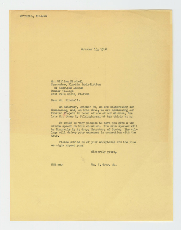 Veterans Village was a housing program created to assist veterans who wished to pursue higher education at Florida A&M College. After First Lieutenant James R. Polkinghorne, Jr., a FAMC student, lost his life in battle in 1948, Veterans Village was dedicated in his honor. These documents detail the process of that feat and the ceremony following.