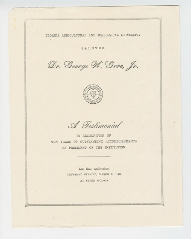 A testimonial recognizing President Gore’s ten-year anniversary of outstanding accomplishments during his tenure at FAMC and FAMU. The celebration honored his decade of leadership with the alma mater, various sing-alongs, and a schedule of remarks and presentations.