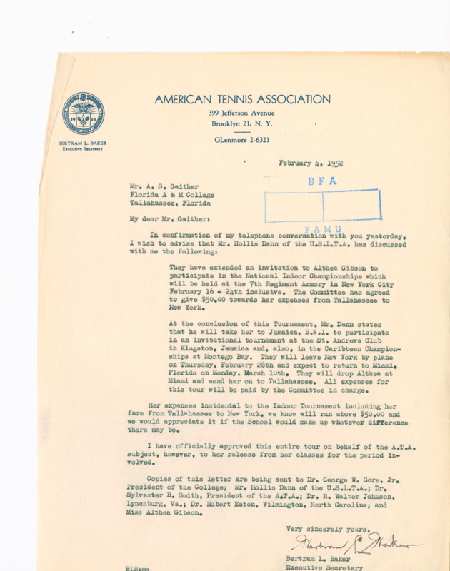 This collection gives astounding insight into the origins of Althea Gibson, the first Black person to win a Grand Slam event and play at Wimbledon. As an alum of Florida A&M, these letters show FAMU’s full support of Gibson through sponsorship of trips to competitions, Gibson’s return of that love, and her balancing her role as a student-athlete.