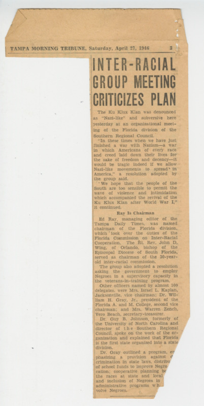 The Tampa Morning Tribune reported on the Florida Division of the Southern Regional Council's strong stance against the Ku Klux Klan, labeling it Nazi-like. Dr. Gray and fellow leaders introduced a comprehensive plan to tackle discrimination in state laws, calling for equal school funding and social progress in Florida.