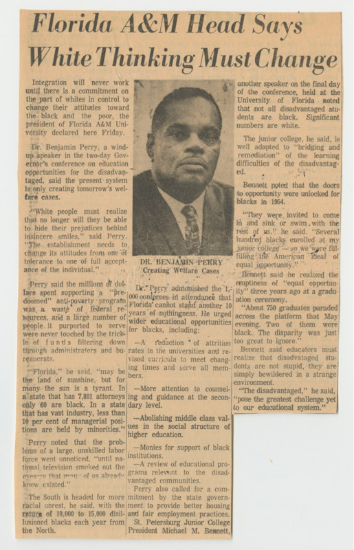 The St. Petersburg Times released this article on Florida A&M President Benjamin L. Perry as a profile feature piece. He vocalizes a resolute position on remaining autonomous and separate from neighboring, predominantly white institution, Florida State University, to fill “an educational gap” caused by “toleration rather than acceptance of blacks.”