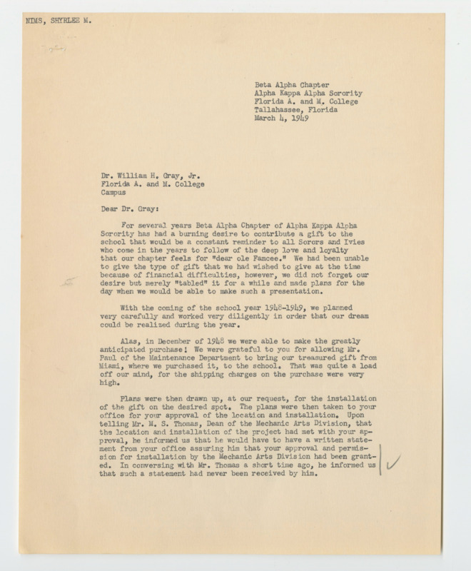 A symbol of Florida A&M, straight down from the Eternal Flame, is the fountain installation before the steps of Coleman Library. In 1949, the Beta Alpha Chapter of Alpha Kappa Alpha Sorority, Inc. was the reason for that gift; these correspondences detail the process behind that.