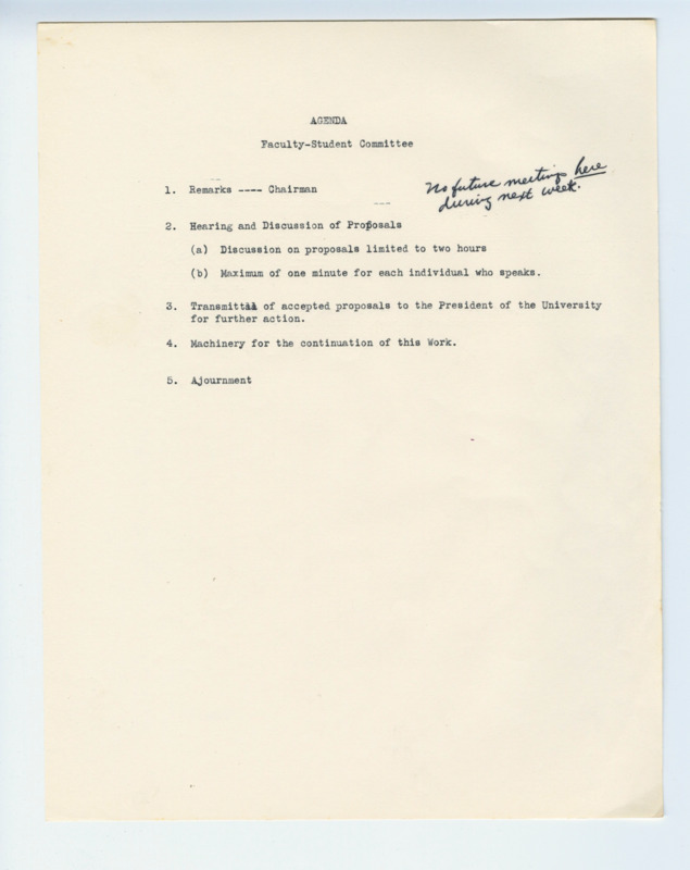 The Faculty-Student Committee agenda begins with remarks from the chairman, followed by a discussion on redefining its role to emphasize Afro-American studies. Proposed enhancements aim to strengthen the committee’s influence on academic progress and campus dialogue, with all proposals awaiting approval from President Gore.