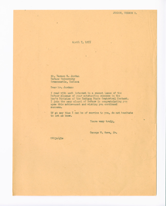 A letter from President George W. Gore to Mr. Vernon E. Jordan extending congratulations on his recent achievements and acknowledging Jordan's dedication and leadership. Gore expresses pride in Jordan’s success and commends his contributions to his field, reinforcing their mutual respect and shared commitment to progress.