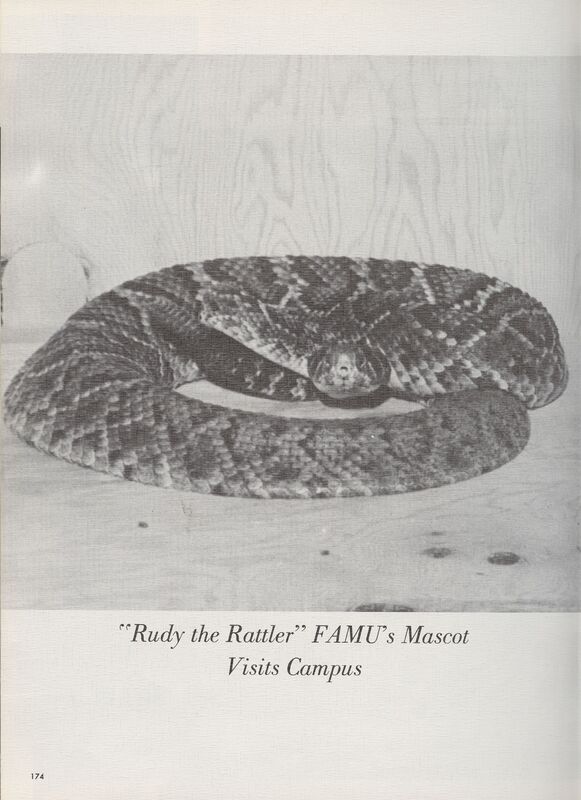 In this photograph obtained from the Rattler 1975, the official Florida A&M University yearbook, the star is “Rudy the Rattler.” Rudy the Rattler was FAMU’s official mascot, a taxidermy rattlesnake sculpture, possibly modeled after a real-life one.