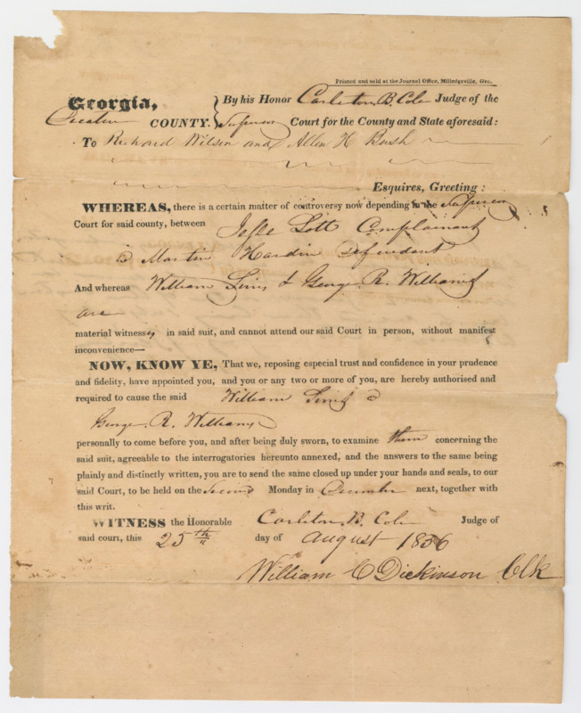 This legal document depicts a Decatur County, Georgia, civil lawsuit presided over by the Honorable Judge Carleton B. Cole and dated October 31, 1836. The writ requests Thomas Bishop’s presence at a meeting on the second Monday in December.