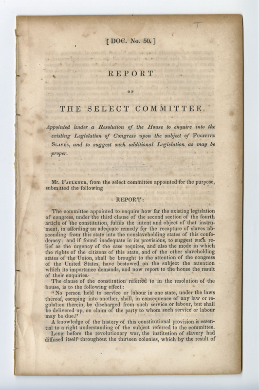 This document is a report of the findings of a committee appointed to interrogate existing legislation regarding the recapture of enslaved persons who would escape from slave states to non-slaveholding states. One of the conclusions of this report was to amend the law “to secure to the slave owners in the south the rights guaranteed to them.”