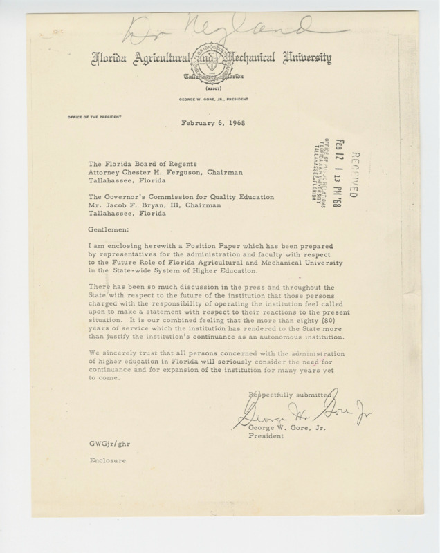 After the Department of H.E.W. ordered Florida to submit its desegregation plan by early February 1974, Chairmans of the Black Coalition for Education, W. George Allen and Gilbert Porter, gathered B. L. Perry and other HBCU leaders to develop a plan. Perry mentions potentially filing ‘a minority report’ and clarifies ‘opinionated’ misinformation.