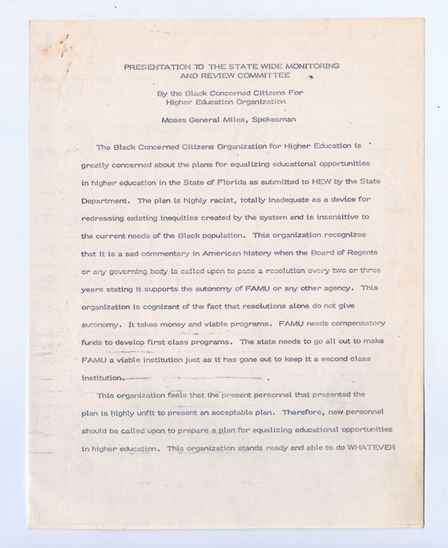 Moses General Miles was the spokesman for the Black Concerned Citizens for Higher Education Organization. The committee was brought together for a presentation to the Statewide Monitoring and Review Committee in response to new HEW standards, which the group claimed were ‘racist,’ ‘inadequate… for redressing existing inequities’ and ‘insensitive.’
