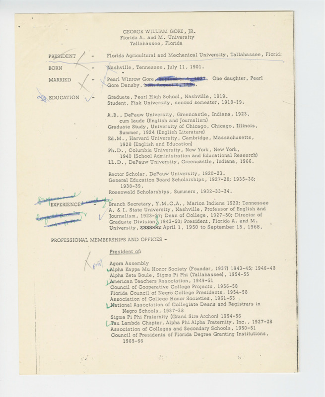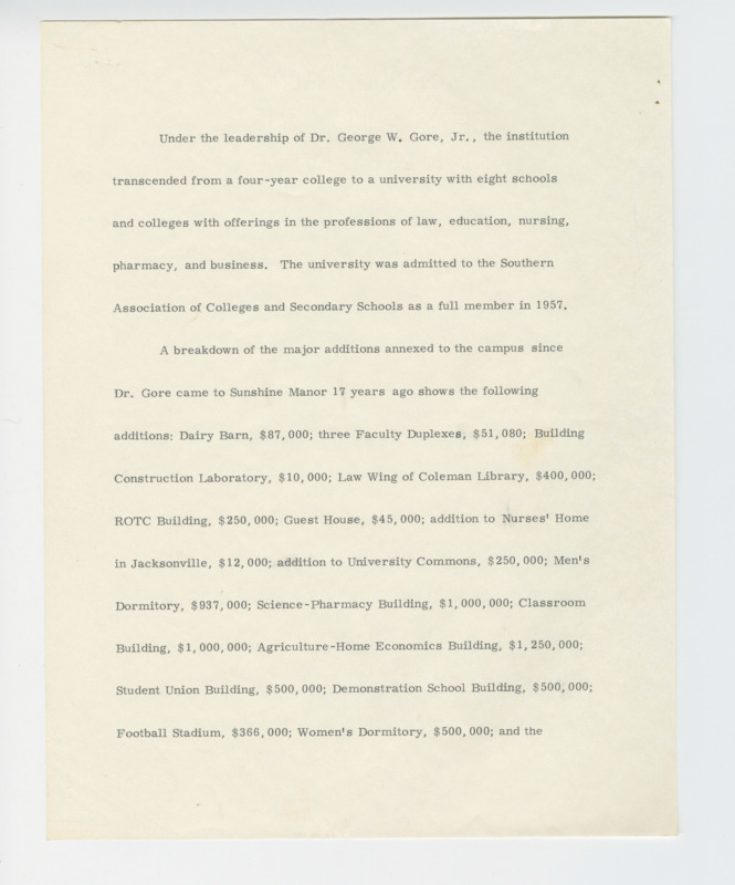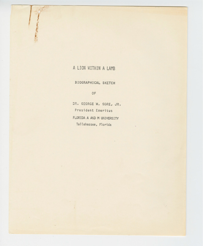 Biographical information on President Gore highlights his education, achievements, and memberships, offering a deeper insight into his life and leadership. These three packets go beyond a biography, providing a sketch of his journey, his transition as a new Floridian, and his transformative impact on FAMC and FAMU during his presidency.