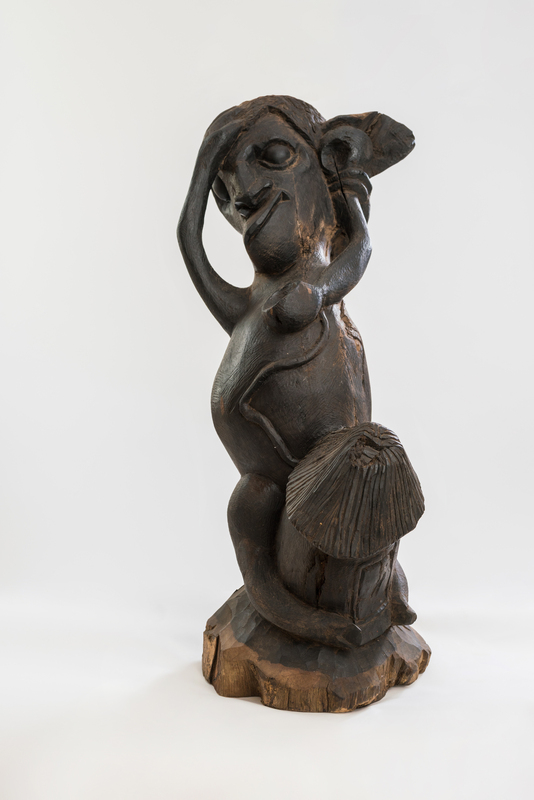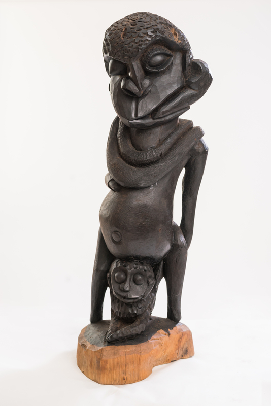 Entrusted to FAMU based on the university's study in agriculture, the Protector of the crops is a spirit deity carved and placed on a farmer's land in Africa as a threat to anyone attempting to trespass. This spirit holds a coiled serpent while protecting a plantain between its feet.