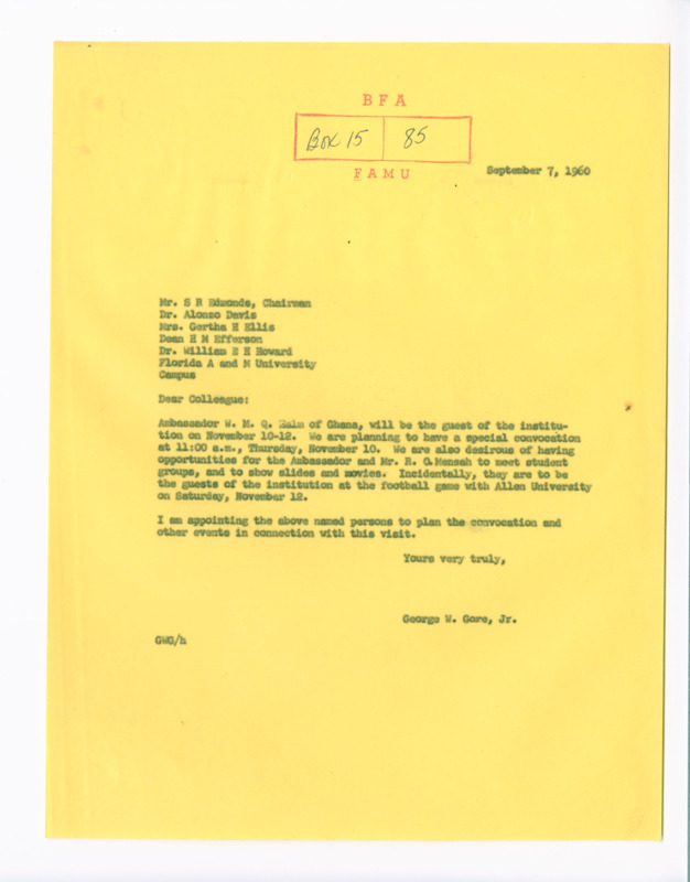 Letters between President Gore and the Embassy of Ghana discuss plans to strengthen educational ties at FAMU for increased access for future Ghanaian students. These exchanges cover scholarship options, academic opportunities, and an invitation for the Ambassador to attend a FAMU football game.