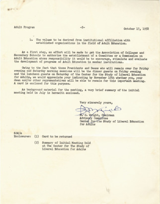 Messages between Mr. Peter Siegle, Research Director at the Center for the Study of Liberal Education for Adults, and President Gore, discuss specific concerns about the challenges faced by the Black community in the South and expanding higher education opportunities for adults.