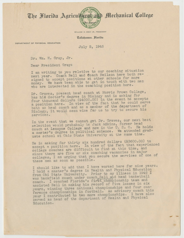 A series of letters between (or CC’d) George W. Gore, Jr. and A. S. Gaither discussing varying topics and an attached Atlanta Daily World article written by Gaither. Over the years, Gore congratulated Gaither and coordinated with him over a Bethune Cookman/Althea Gibson celebration/campus visit, football game schedules, and leadership changes.