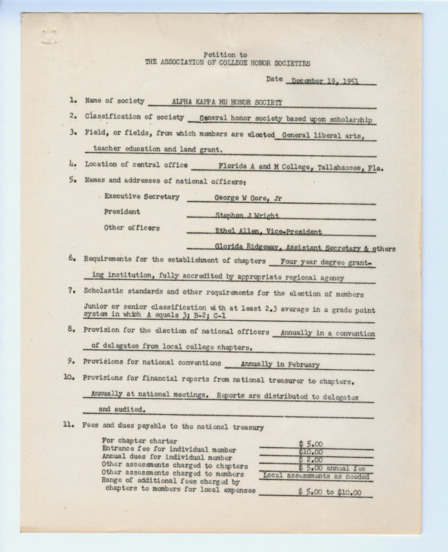 This document shows the origins of the Alpha Kappa Mu Honor Society, a general honor society based upon scholarship created by George W. Gore, Jr. This application was authorized in 1951 at the convention and action of the executive committee.
