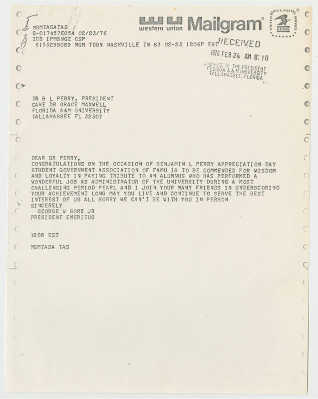 Messages celebrating President B. L. Perry’s Appreciation Day include notes from Former President Gore, who expressed regret for his absence, and C.K. Steele, who praised Perry’s impactful leadership. A convocation pamphlet, sponsored by the Student Government Association, outlines the day’s events honoring President Perry’s dedication to FAMU.