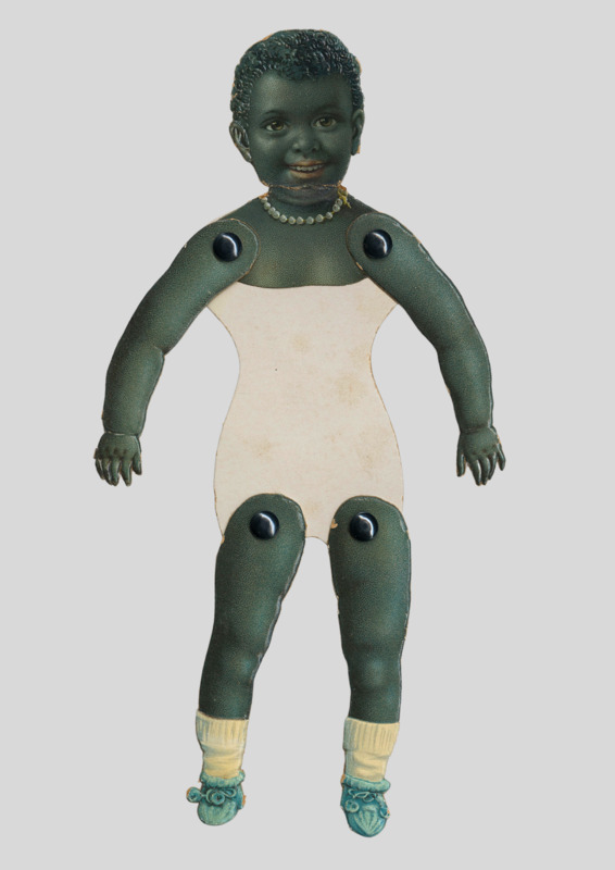 Black paper doll features movable joints, cut from paper and assembled with small fasteners. The doll, reflecting 19th-century craftsmanship. These dolls, often simple in design, were popular children's toys, but also highlight complex themes of race and identity in post-Reconstruction America.