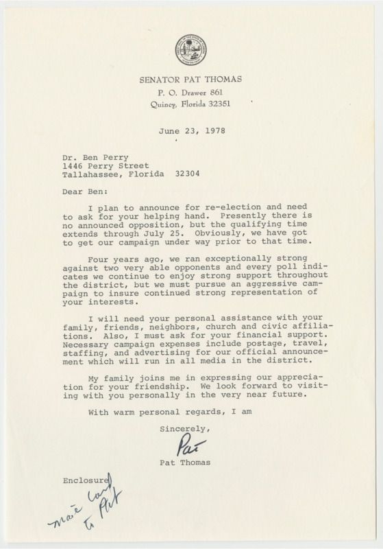 A series of letters from Democratic Senator Pat Thomas asking for his friend, Dr. B. L. Perry Jr.’s, help in his re-election bid, and a $25 donation check from Dr. Perry to Thomas’ campaign made on August 2, 1978. Thomas requested Dr. Perry’s personal connections and financial support and expressed his thanks once successfully re-elected.