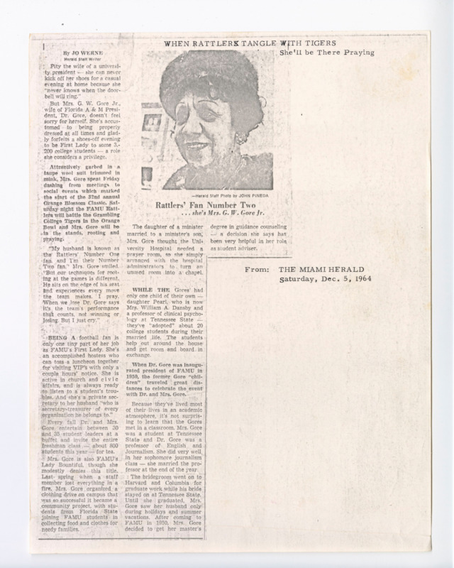 A collection of letters and newspaper clippings about First Lady Pearl Gore, along with personal memorabilia, provides a glimpse into her impactful role at FAMC. These separate pieces highlight her contributions, her connection to the community, and the legacy she helped shape alongside her husband, President George W. Gore.