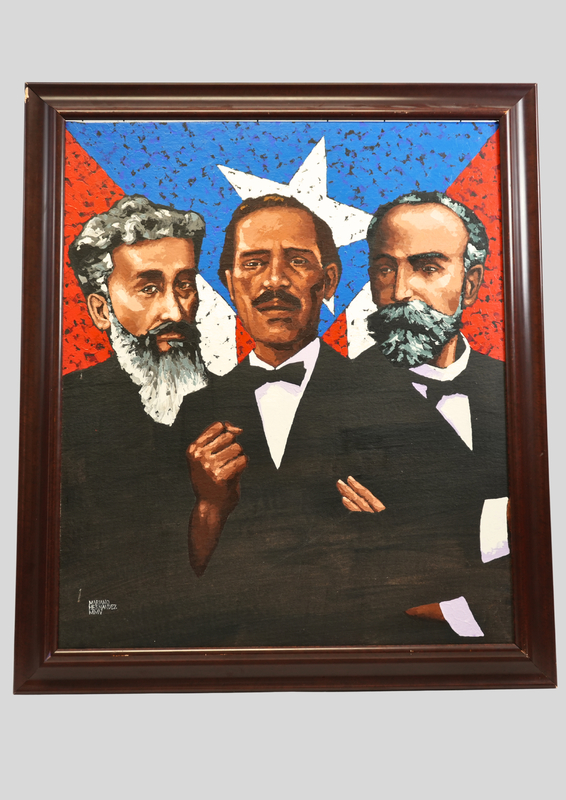In this original 2005 piece by Mariano Hernandez, physician Ramon Emetrio Betances and attorneys Pedro Albizo Campos and Eugenio Maria de Hostos are honored as instrumental leaders in the Puerto Rican independence movement. FAMU alum and former assistant director for the Meek-Eaton Black Archives Dr. Will Guzman donated this artwork.