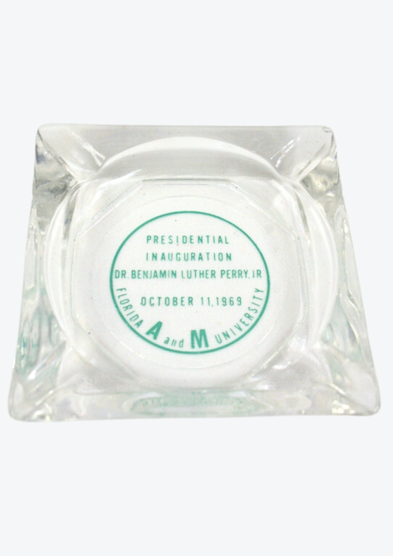 A 1969 presidential inauguration ashtray that commemorates the swearing-in of President B.L. Perry at Florida Agricultural and Mechanical University. As a historical artifact, it symbolizes his leadership during a transformative period for FAMU, marking a significant moment in the university's growth and development.