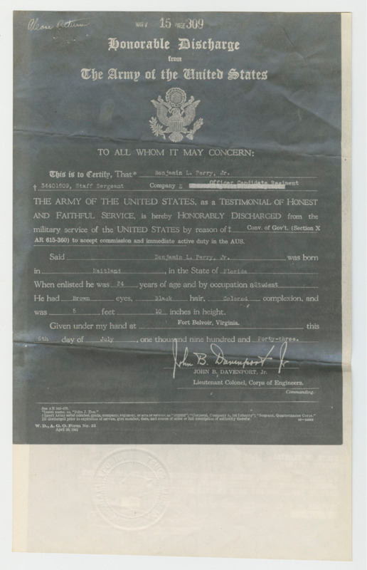 An official enlistment record of Benjamin L. Perry, Jr., a staff sergeant who served for nine months and 26 days under the Corps of Engineers in the 1940s. This document shows the well-rounded experience of the future president of Florida A&M University, clarifying his vaccinations, “excellent” character, marital status, and honorable discharge.