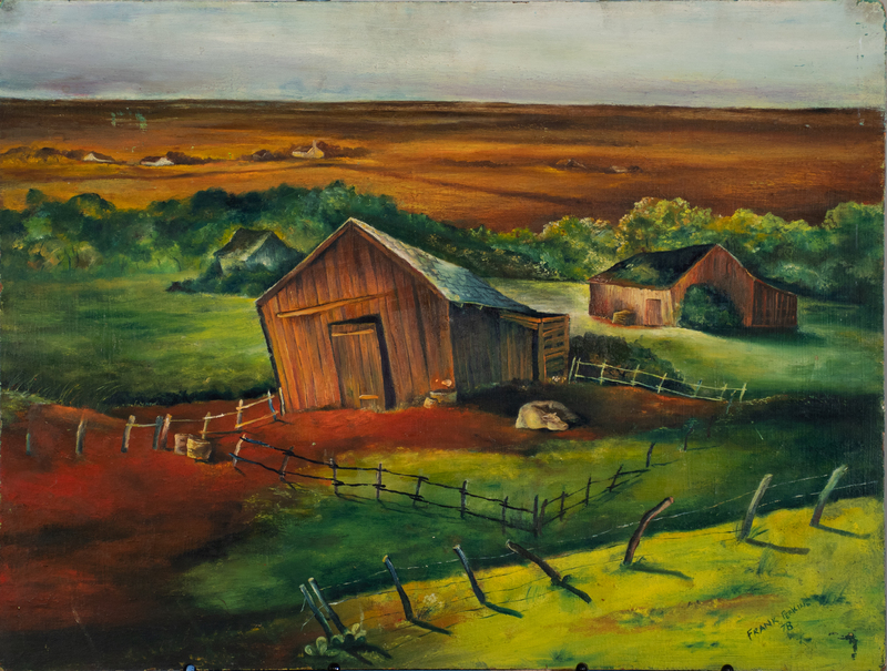 Perkins’ landscape painting displays a rural scene featuring barns, farmhouses, and a sleeping cow. The landscape is divided with lush greenery and dry, brown land. The fence shows its age in its bent and leaning posts. Dr. John Biggers encouraged Texas Southern student artists to create art based on what they saw – perhaps this instruction inspired Perkins, who may have grown up in a rural environment similar to this one.