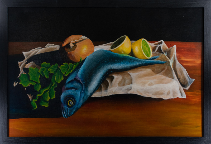 Hinojos' painting, "Pescador de Hombres," draws on Christian themes. The painting references the story of Jesus' miraculous feeding of the multiple with bread and fish, but also a symbolic representation of Christ as the "Bread of Life," a source of spiritual sustenance. Hinojos is a graduate of Texas Southern, accomplished airbrush artist, and founder of the Houston Art Center, an organization that aims to support artists in the Hobby area of Houston.
