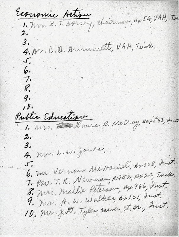 The Tuskegee Civic Association (TCA) calling a mass meeting in response to Senate Bill 291, included a message from K. L. Buford, a local minister and activist in Tuskegee, and speeches of support by Fred Shuttlesworth, Ralph David Abernathy, and Dr. Martin Luther King, Jr.