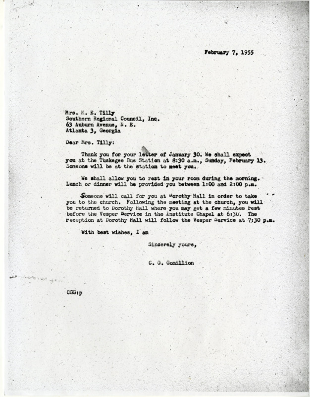 A letter from Charles G. Gomillion to Mrs. Dorothy Tilly explaining the itinerary of her visit and stating that someone will be at the bus station to meet and pick her up.