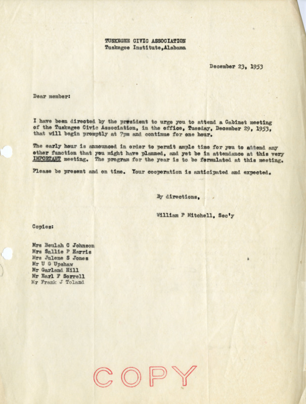 A letter for the Tuskegee Civic Association secretary William P. Mitchell requesting the presence of each member which is needed for an important upcoming TCA meeting.
