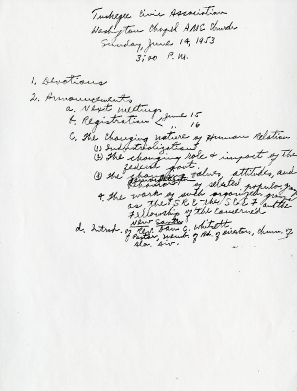 Series of mass meetings sponsored by the Tuskegee Civic Association. The meeting was held at the Greenwood missionary Baptist church. The speaker for the occasion is Reverend S.T. Martin.