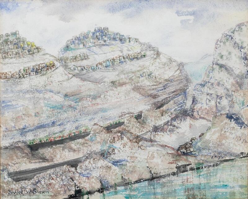 Jewell Woodard Simon was an internationally acclaimed artist, teacher, and poet from Houston, TX. Ensenada Passage illustrates a mountainous path to Ensenada, Mexico. A bridge leading to the city is in the foreground, roads lay in the middle ground, and the mountains build up towards the sky, creating an atmospheric perspective.
