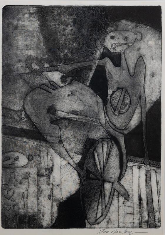 James Newton was a painter, printmaker, scholar, and professor from Delaware. Desperate Faith is a print depicting a mystical figure riding a unicycle as another figure watches. The dark, eery background contributes to the surrealism of the piece.
