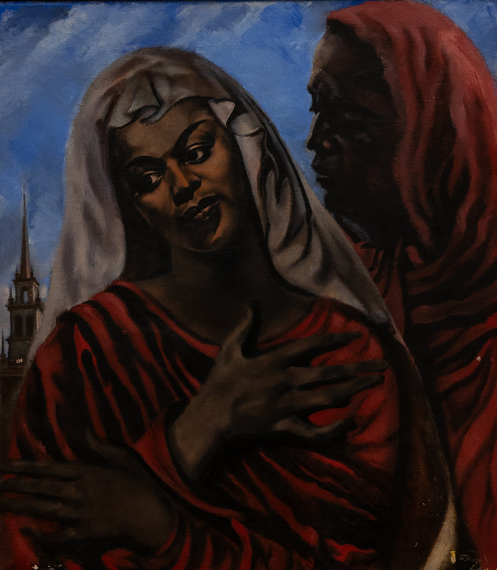 Romeyn van Vleck Lippman was a 19th-century painter and educator. Church is a portrait of a man and woman with a cathedral in the distance. The woman embraces herself and glances away from the man as he leans toward her. They both wear red cloaks, and the woman wears a white headdress.