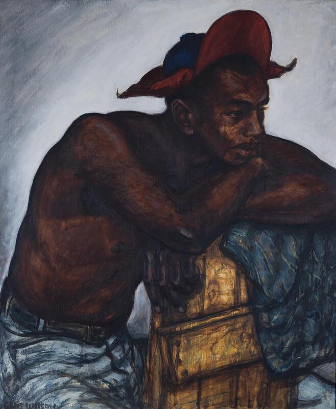 Hayward Oubre was a multimedia artist and educator from New Orleans, LA. Equivocal Fox is an abstract depiction of a fox using polygonal shapes. The red and blue forms overlap throughout the painting. The entire artwork is painted with a bumpy texture, which creates a slight relief sculpture effect.