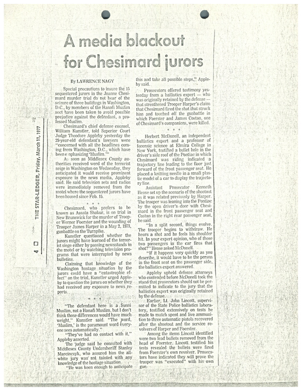 A newspaper article from The Star Ledger about the 15 sequestered jurors in the Assata Shakur (JoAnne Chesimard) trial for the 1973 killing of a state trooper being given a media blackout after the seizure of three buildings in Washington, D.C. by the Hanafi Muslim sect to avoid possible prejudice against Shakur, a professed Muslim.