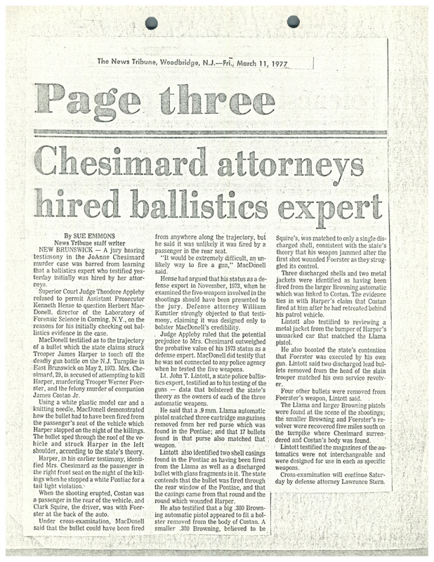 A newspaper article from The News Tribune about testimony on ballistics and gunshot trajectories given by two different expert witnesses in the trial of Assata Shakur (JoAnne Chesimard) for the 1973 killing of a state trooper. The judge in the case barred the jury from learning that one of the experts was hired by the defense.